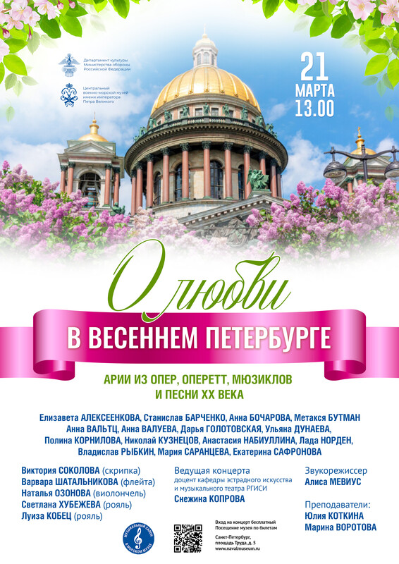 21 марта в 13 часов в рамках проекта "Музыкальный салон в Морском музее" приглашаем вас на концерт «О любви в весеннем Петербурге». Прозвучат арии из опер, оперетт, мюзиклов и песни XX века. Ведущая концерта доцент кафедры эстрадного искусства и музыкального театра РГИСИ Снежина Копрова.