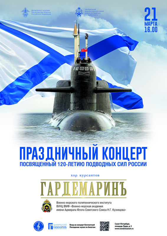 21 марта в 16 часов в стенах Центрального военно-морского музея начнется праздничный концерт, посвященный 120-летию Подводных сил России.