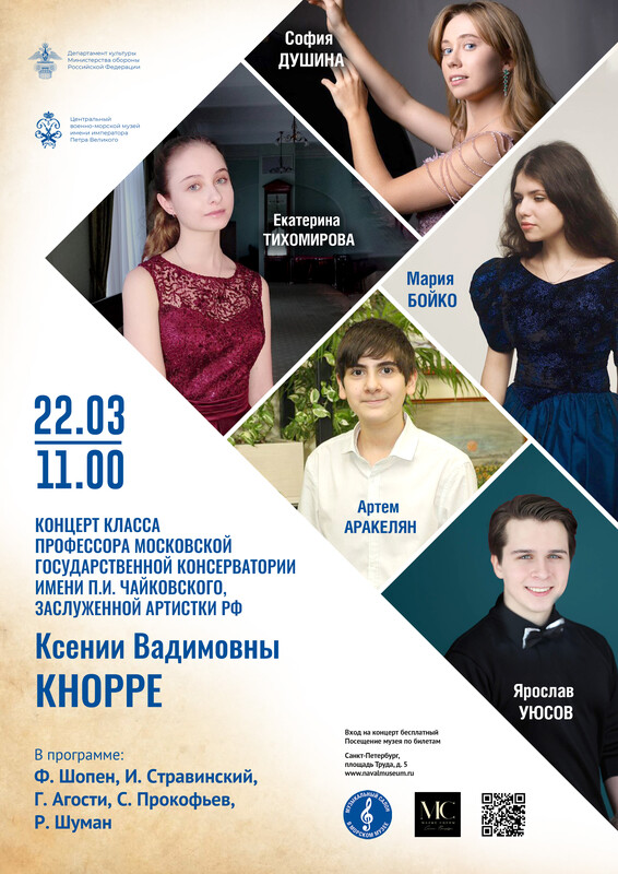 22 марта в 11 часов в ЦВММ состоится концерт класса профессора Московской консерватории имени П.И. Чайковского, заслуженной артистки России Ксении Кнорре. В программе произведения Шопена, Стравинского, Агости, Прокофьева и Шумана.