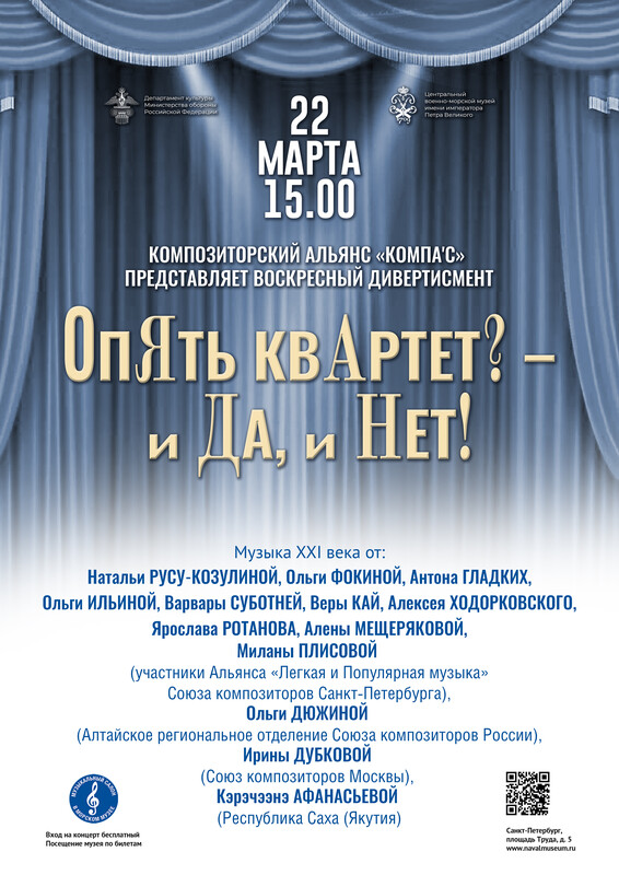 22 марта в 15 часов композиторский альянс «Компа′с» представит в ЦВММ воскресный дивертисмент «ОпЯть квАртет? – и Да, и Нет!».
