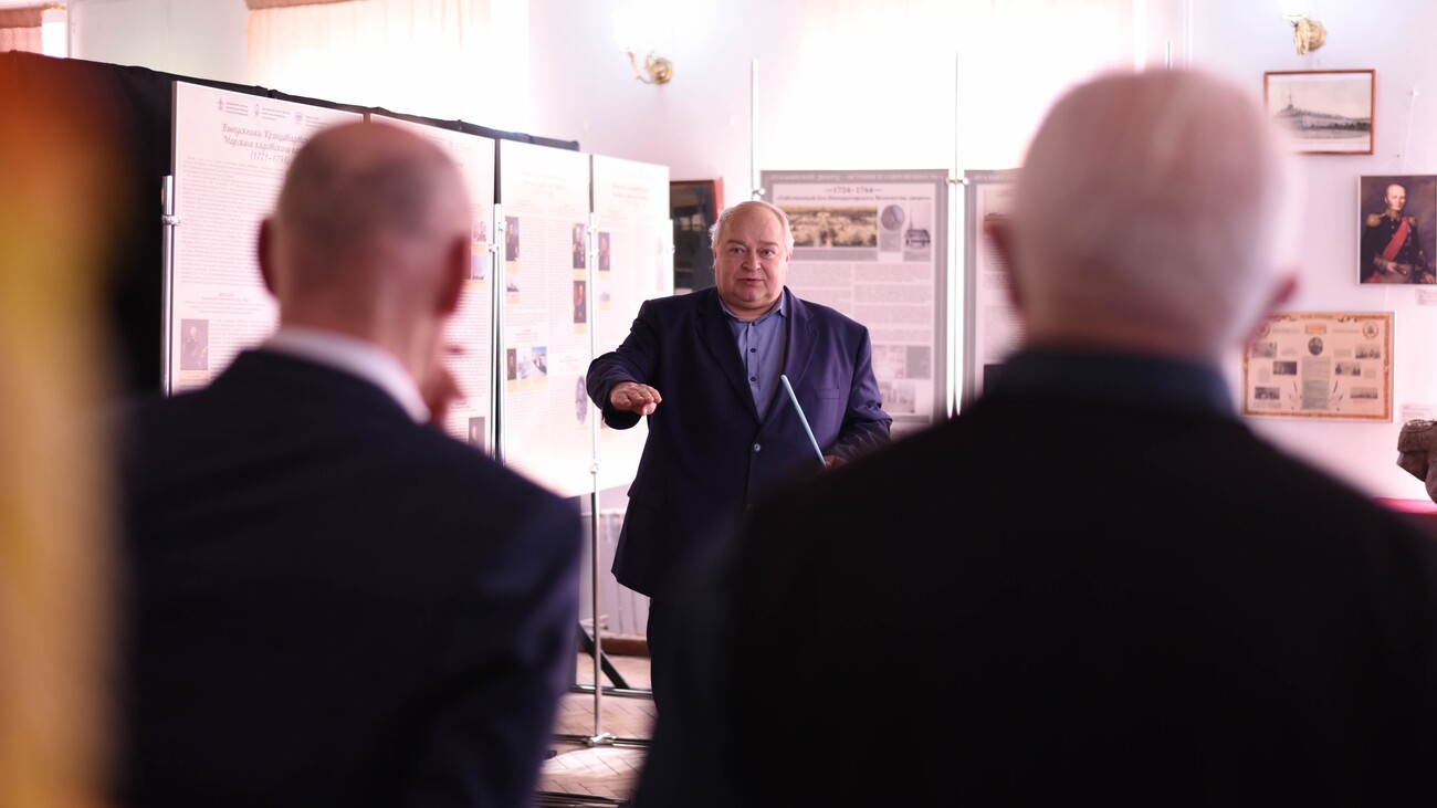 Научный сотрудник музея Александр Иванович Левченко представил посетителям подробный рассказ о самых известных воспитанниках Морского кадетского корпуса, чья учеба проходила в стенах этого здания.