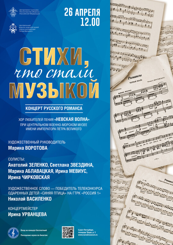 26 апреля в 12 часов в стенах Центрального военно-морского музея начнется концерт русского романса «Стихи, что стали музыкой» в исполнении Хора любителей пения при Центральном военно-морском музее имени императора Петра Великого.