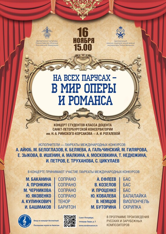 16 ноября в 15 часов приглашаем вас на концерт студентов класса доцента Санкт-Петербургской консерватории им. Н.А.Римского-Корсакова А.И.Рогалевой «На всех парусах – в мир оперы и романса».