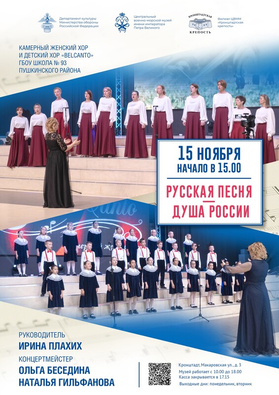 15 ноября в 15 часов филиал ЦВММ «Кронштадтская крепость» (Итальянский дворец) приглашает на концерт "Русская песня - душа России" в исполнении хоровых коллективов BelCanto. Руководитель Ирина Плахих. Концертмейстеры Ольга Беседина и Наталья Гильфанова.