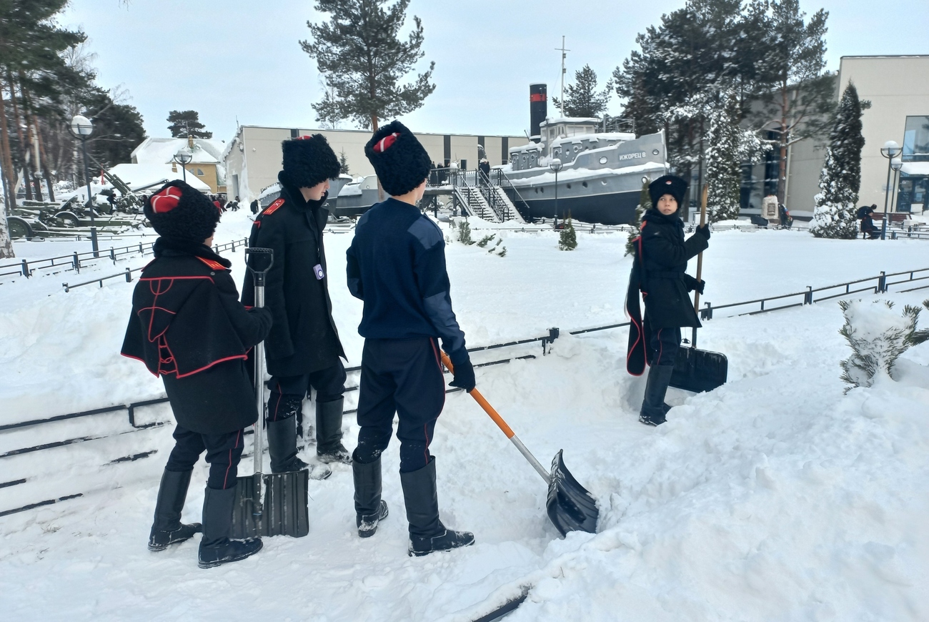 Особенный восторг у гостей с юга вызвала зимняя природа Приладожья. Обилие снега, белоснежные просторы и ледяной покров озера стали для них настоящим чудом. Не ограничиваясь ролью наблюдателей, юноши-кадеты с энтузиазмом предложили свою помощь в уборке территории музея и с радостью взялись за лопаты, превратив знакомство с северной зимой в практическое дело.