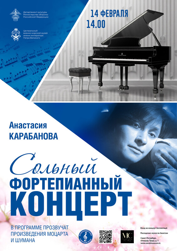 14 февраля в 14 часов в рамках проекта "Музыкальный салон в Морском музее" приглашаем вас на сольный фортепианный концерт Анастасии Карабановой.