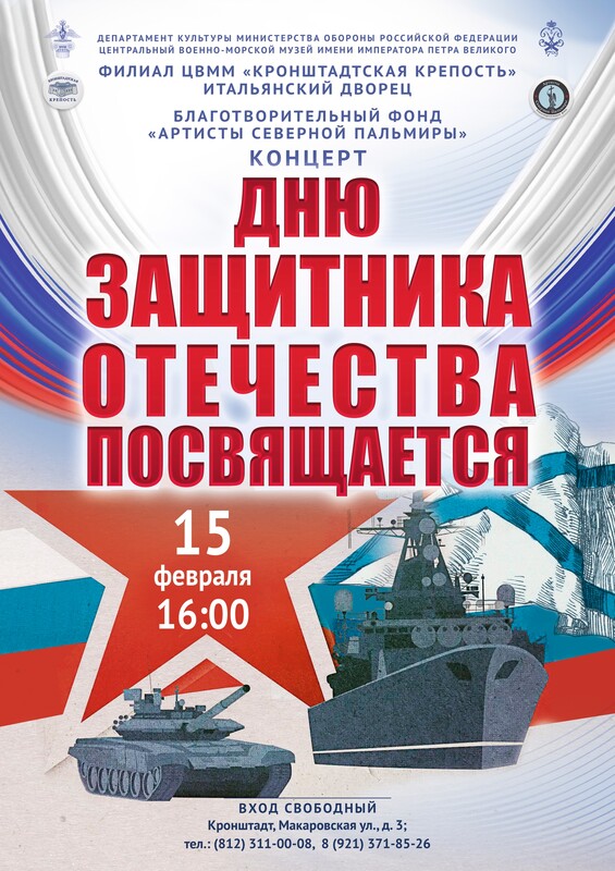 15 февраля в 16 часов в Итальянском дворце филиала ЦВММ «Кронштадтская крепость» начнется концерт "Дню Защитника Отечества посвящается..." организованный совместно с благотворительным фондом «Артисты Северной Пальмиры". Принимают участие артисты театра и кино, эстрадные исполнители. Концерт проходит в День война-интернационалиста и в преддверии Дня Защитника Отечества.