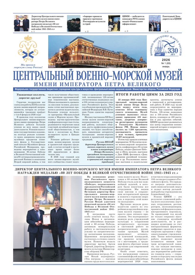 Первый номер издания открывает репортаж о награждении директора Центрального военно-морского музея имени императора Петра Великого Руслана Шамсудиновича Нехая медалью "80 лет Победы в Великой Отечественной войне 1941 и 1945 гг.". Так Министерство обороны Российской Федерации оценило вклад директора и всего коллектива ЦВММ в подготовку и проведение торжеств и памятных событий юбилейного года. Об этом, принимая награду сказал Р.Ш.Нехай: "Эта награда - высокая оценка труда всего коллектива нашего музея. Подготовка к 80-летию Великой Победы стала для нас важнейшей задачей, в которую были вовлечены все сотрудники. Мы видим свою миссию в сохранении исторической правды и памяти о героизме моряков, в передаче этой памяти молодежи". Итоги работы в 2025 году ЦВММ подвел в январе 2026 года в 317 годовщину своего основания. Об итогах работы музея отдельный материал на первой странице. Много репортажей в 1(69)-м номере посвящено филиалам музея. Читателям может быть интересен исторический очерк к 100-летию принятия первой советской кораблестроительной программы (1926-1932 гг.), а также история строительства карбаса "Питон" в стенах Нахимовского военно-морского училища в г.Мурманск и др. Первый номер газеты открывает имя первого в 2026 году посетителя музея. Среди важных гостей января 2026 года - 6-летний Алеша из Арзамаса, побывавший в ЦВММ в рамках благотворительной акции "Елка желаний".